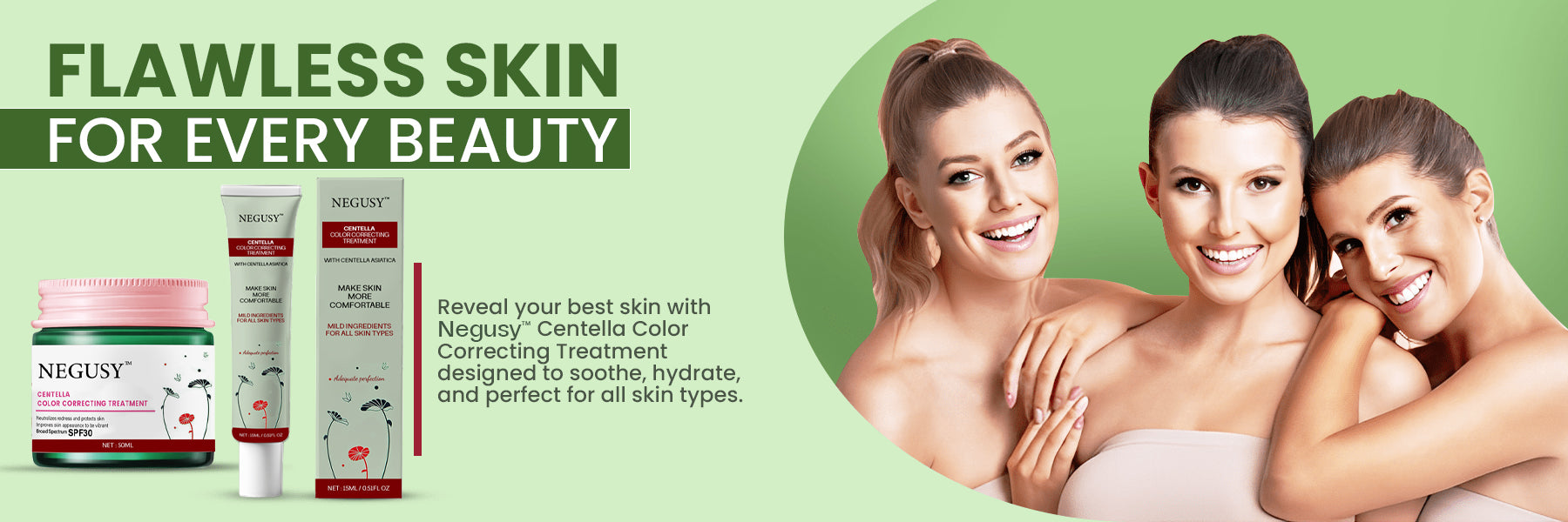 Negusy™ Centella Correcting Treatment is a multi-functional skincare product designed to balance skin tone, conceal redness, and reduce the appearance of dark spots while providing hydration and nourishment for a healthy, radiant complexion.