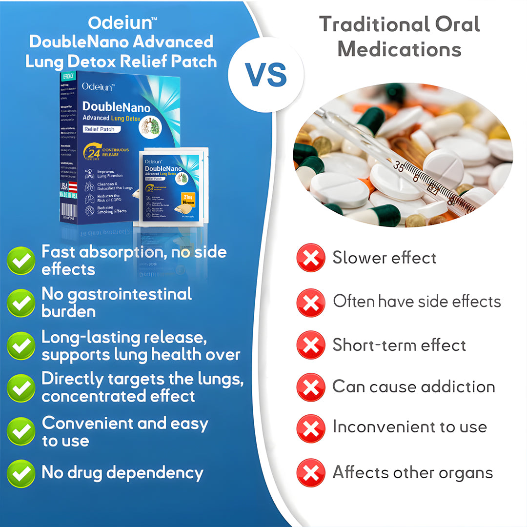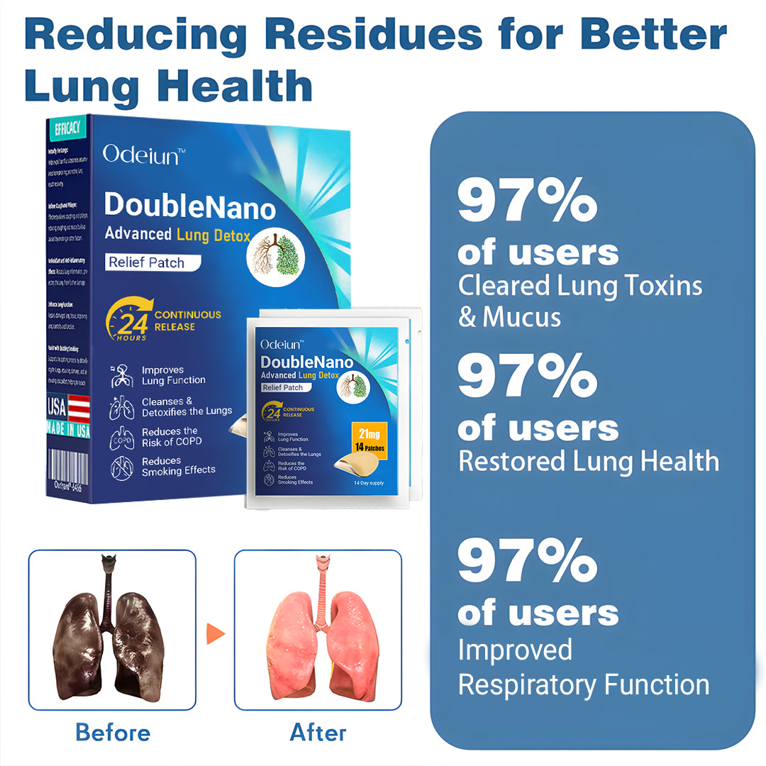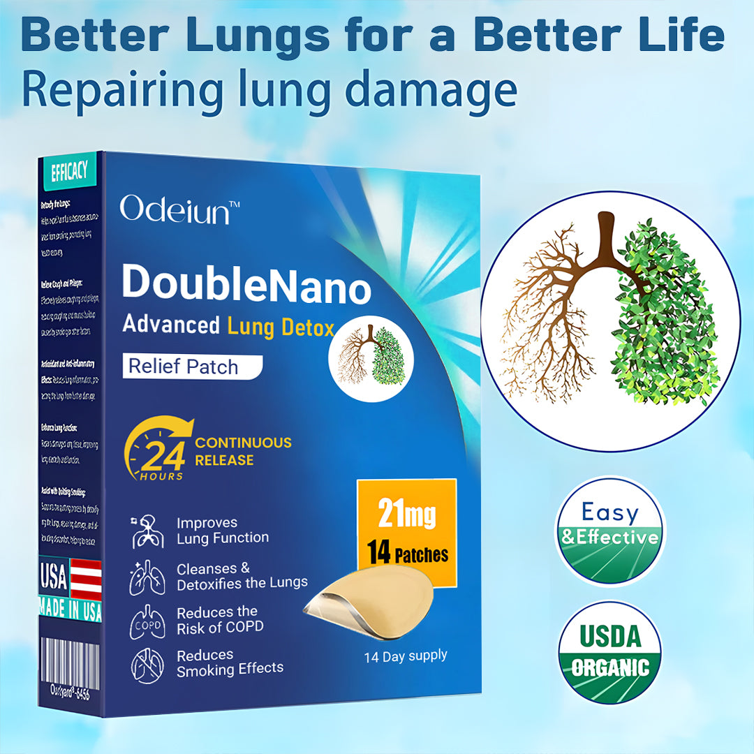 The Odeiun™ 𝐃𝐨𝐮𝐛𝐥𝐞𝐍𝐚𝐧𝐨 𝐀𝐝𝐯𝐚𝐧𝐜𝐞𝐝 𝐋𝐮𝐧𝐠 𝐃𝐞𝐭𝐨𝐱 𝐑𝐞𝐥𝐢𝐞𝐟 𝐏𝐚𝐭𝐜𝐡 utilizes advanced natural therapy with a focus on ingredients like N-Acetylcysteine (NAC), Astaxanthin, and Turmeric Extract. The patch’s cutting-edge transdermal technology enables the active ingredients to penetrate deeply, providing immediate relief. It enhances blood circulation in the lungs, clears mucus and toxins, and helps open the airways, significantly supporting lung health and improving respiratory function.