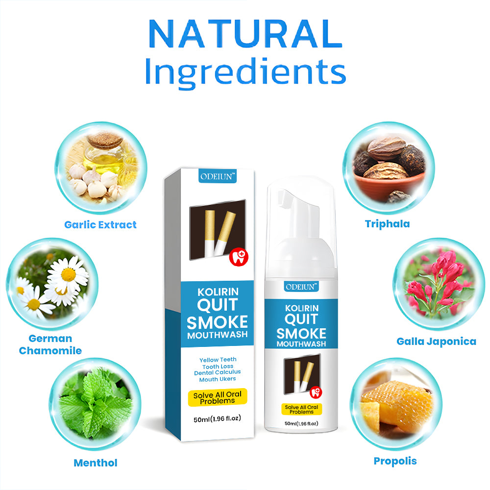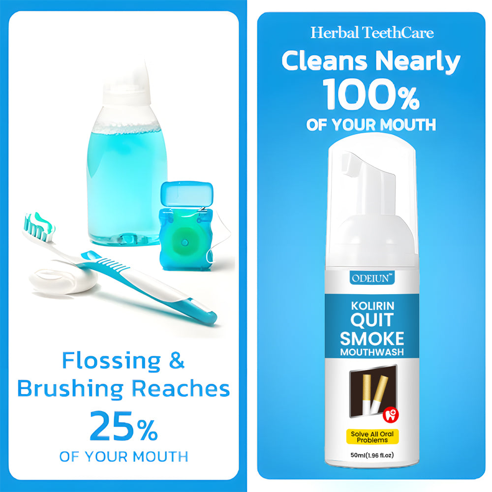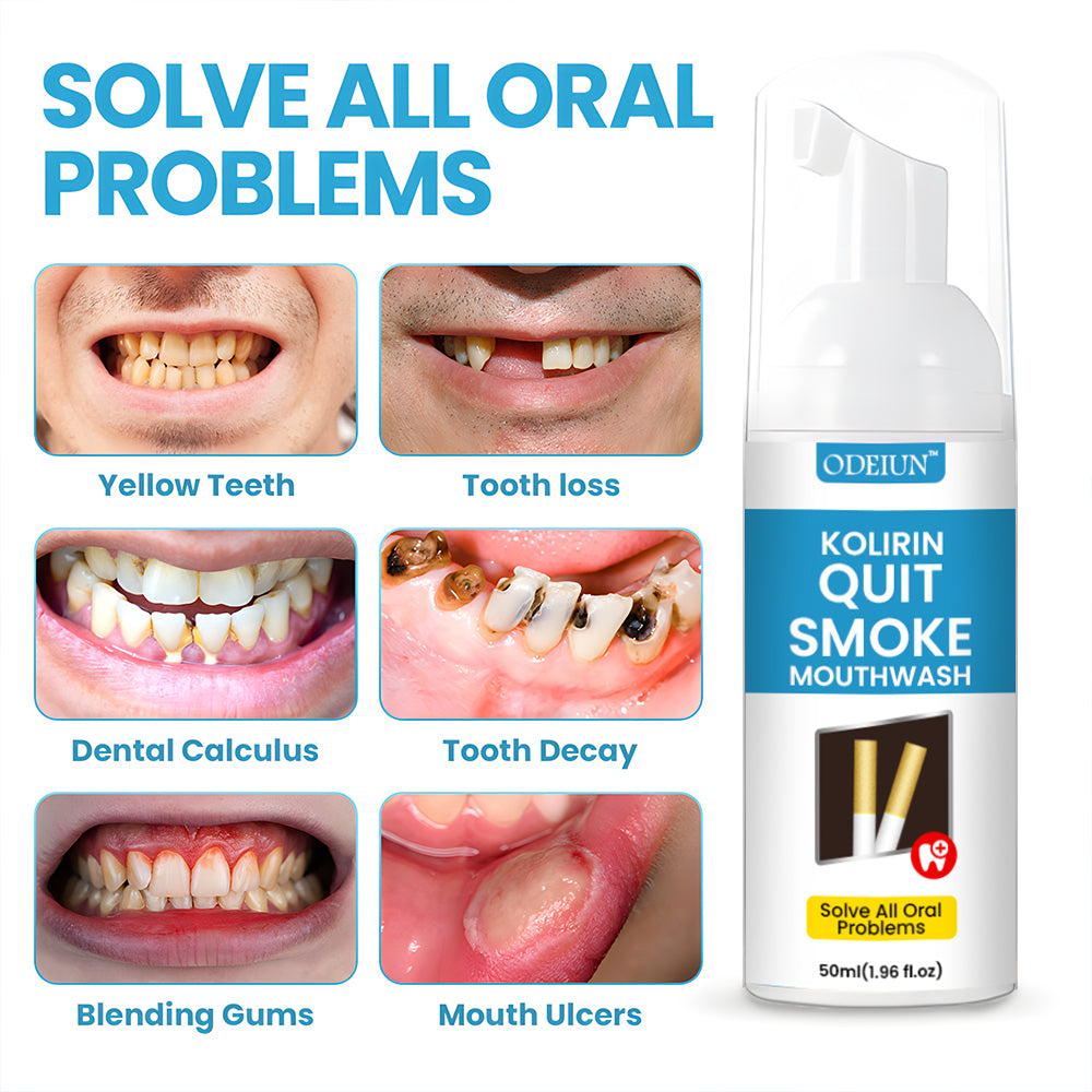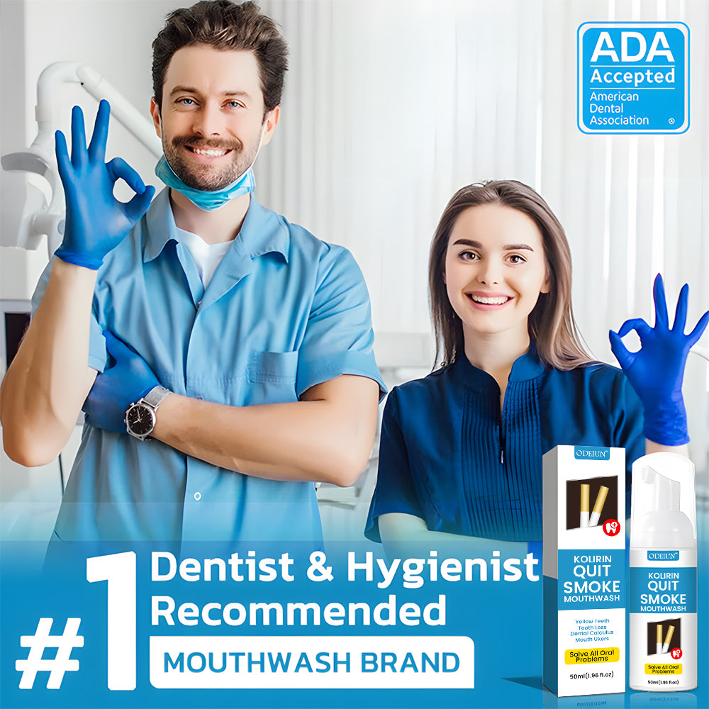 Odeiun⢠Kolirin QuitSmoke Mouthwash is the latest product certified by the American Dental Association and recommended by dentists. It can perfectly solve all oral problems, including dental calculus, bad breath, oral ulcers, dental caries, bleeding gums, tooth sensitivity, gingivitis, loose teeth, periodontitis, swollen gums, tooth damage, tooth loss, etc. No side effects. Made from 100% natural herbs. Suitable for everyone, including children, young people, and the elderly.